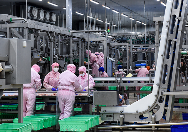 “以前在肉雞從運雞車上卸下至雞毛被打凈的前處理區(qū),卸雞、分籠、電暈工序由人工操作,作業(yè)環(huán)境較臟需要經(jīng)常清洗,工人勞動強度大,產(chǎn)品偶爾會產(chǎn)生淤血、斷翅現(xiàn)象。”肉雞加工事業(yè)部總經(jīng)理張金龍介紹,從國外引進先進的活禽自動裝卸、二氧化碳擊暈系統(tǒng)后,改為自動卸雞和二氧化碳擊暈,大幅提升裝雞、卸雞效率,降低運輸過程中雞只死亡率和雞只淤血、斷翅比例。