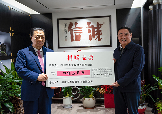 11月6日,圣農(nóng)集團(tuán)創(chuàng)始人傅光明向福建省公安民警英烈基金會捐贈300萬元。福建省公安民警英烈基金會理事長李堅(jiān)一行專程來到圣農(nóng)集團(tuán),向集團(tuán)創(chuàng)始人傅光明頒發(fā)榮譽(yù)理事長證書。