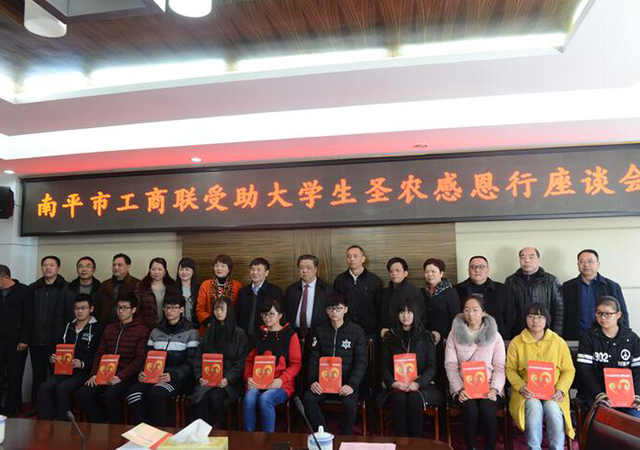 2月15日,南平市工商聯(lián)受助大學(xué)生圣農(nóng)感恩行活動在圣農(nóng)集團總部舉行。市工商聯(lián)主席、福建圣農(nóng)發(fā)展股份有限公司董事長傅光明向閩北十縣(市、區(qū))的10名貧困大學(xué)生發(fā)放2萬元助學(xué)金和1千元新年紅包。